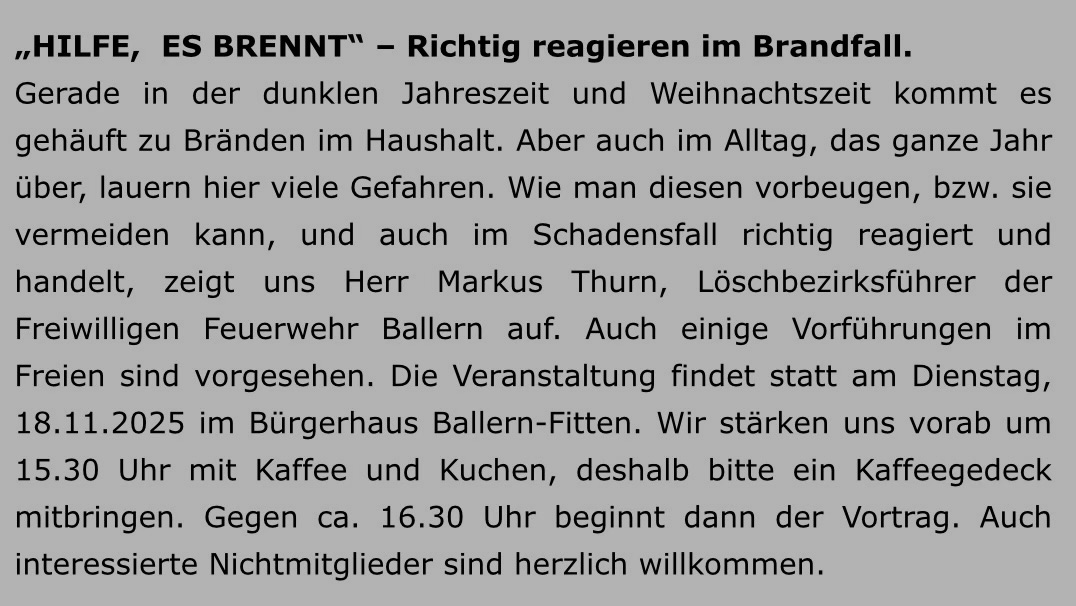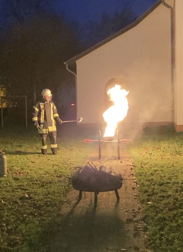 Der Löschbezirksführer der Freiwilligen Feuerwehr Ballern, Herr Markus Thurn, präsentierte uns in einem sehr lehrreichen und interessanten Vortrag, wie man Bränden vorbeugen/vermeiden kann, aber auch wie man richtig reagiert, wenn dann doch mal was passiert: Brandklassen, Einsatz von geeigneten Löschmitteln, richtiger Umgang mit Feuerlöschern, Melden eines Brandes bei der Notrufnummer 112. Wie wichtig dieses Thema ist, zeigten auch die vielen Fragen die an Markus Thurn gestellt wurden. Zum Abschluss der Veranstaltung führten uns Ballerner Feuerwehrleute im Freien eindrucksvoll vor, wie gefährlich unsachgemäße Löschversuche von Fettbänden mit Wasser (z.B. Friteusen/Pfannen) sein können. Das Ausmaß einer solchen Fettexplosion ist enorm.